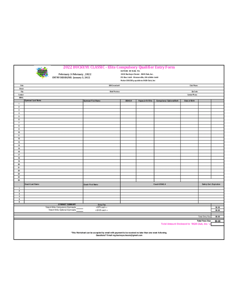 2022 BUCKEYE CLASSIC Elite Compulsory Qualifier Entry Form RETURN BY MAIL TO:February 3February, 20222020 Buckeye Classic BGB Club, Inc. ENTRY DEADLINE: January 3, 2022PO Box 1468 Westerville, OH