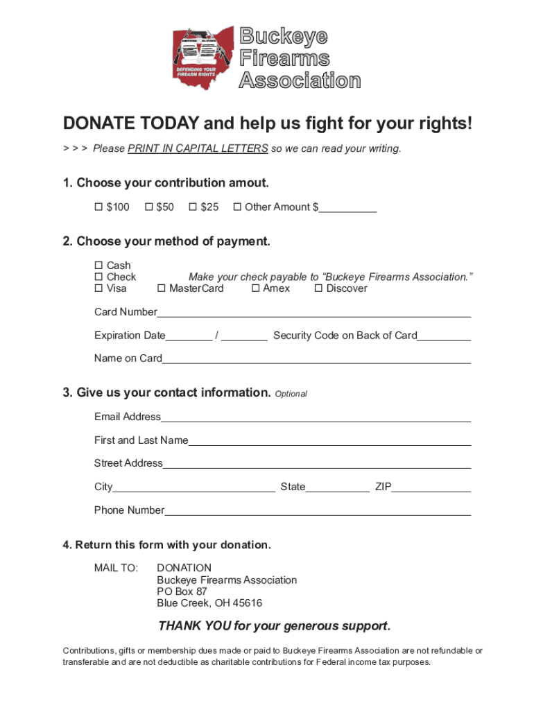 Buckeye Firearms Association DONATE TODAY and help us fight for your rights! Please PRINT IN CAPITAL LETTERS, so we can read your writing.1. Choose your contribution about. $$$1005025 Other Amount