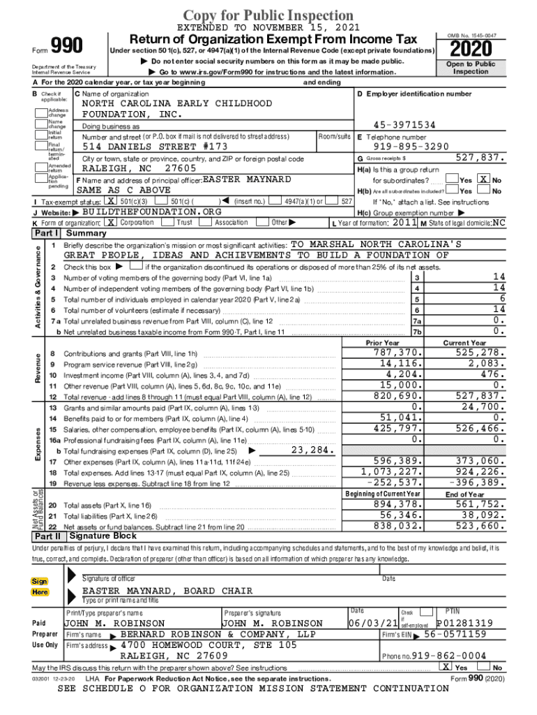 Copy for Public InspectionFormEXTENDED TO NOVEMBER 15, 2021990OMB No. 15450047Return of Organization Exempt From Income Tax2020Under section 501(c), 527, or 4947(a)(1) of the Internal Revenue Code