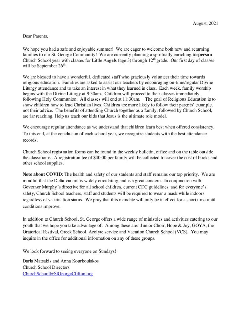 August 2021 Dear Parents, We hope you had a safe and enjoyable summer! We are eager to welcome both new and returning families to our St. George Community! We are currently planning a spiritually