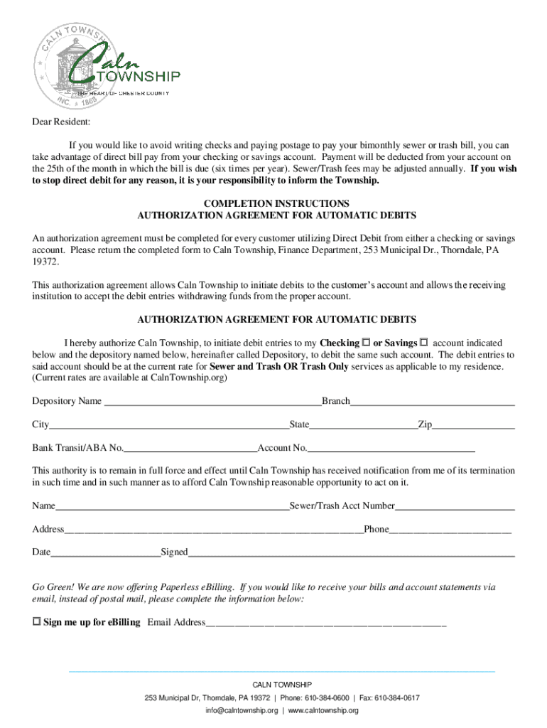 Dear Resident: If you would like to avoid writing checks and paying postage to pay your bimonthly sewer or trash bill, you can take advantage of direct bill pay from your checking or savings account.