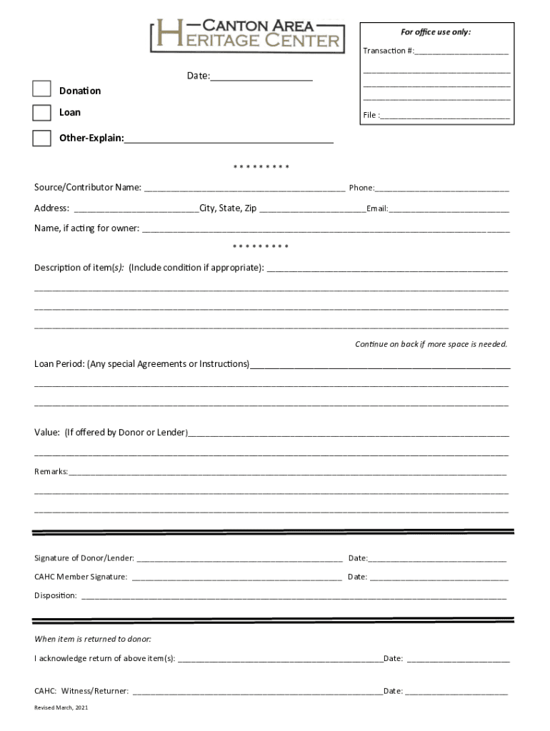 For office use only: Transaction #: Donation Loanable : Date: OtherExplain: *********Source/Contributor Name: Phone: Address: City, State, Zip Email: Name, if acting for owner: *********Description