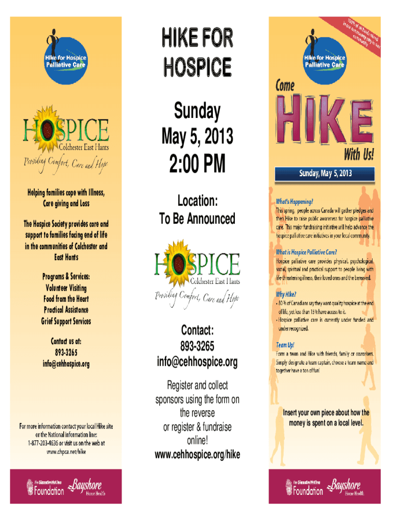 HIKE FOR HOSPICE Sunday, May 5, 20132:00 PM Helping families cope with Illness, Care giving and Loss The Hospice Society provides care and support to families facing end of life in the communities