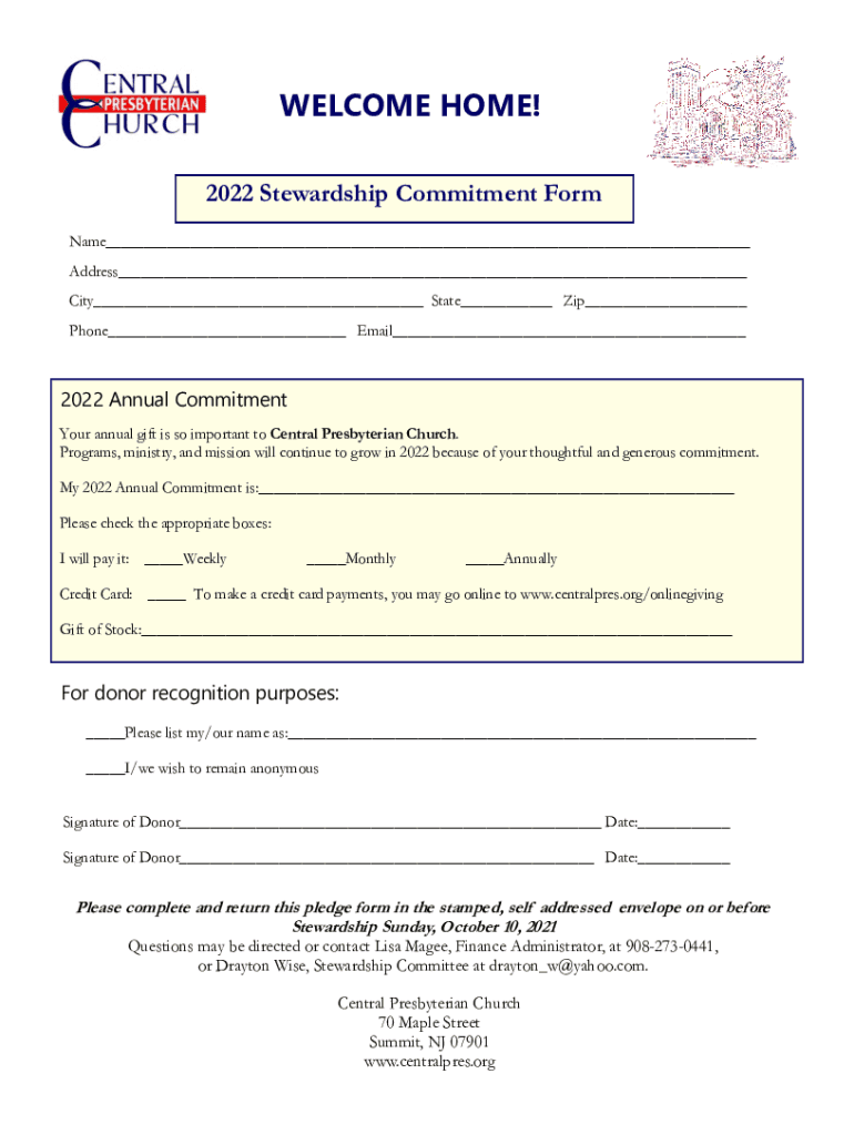 WELCOME HOME! 2022 Stewardship Commitment Form Name Address City State Zip Phone Email 2022 Annual Commitment Your annual gift is so important to Central Presbyterian Church. Programs, ministry, and