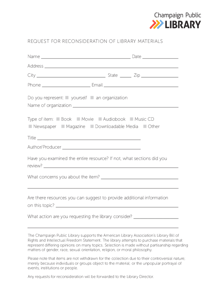 REQUEST FOR RECONSIDERATION OF LIBRARY MATERIALS NameDateAddressCityPhoneStateZipEmailDo you represent: yourself an organization Name of organizationType of item: Book Newspaper Title Movie Magazine