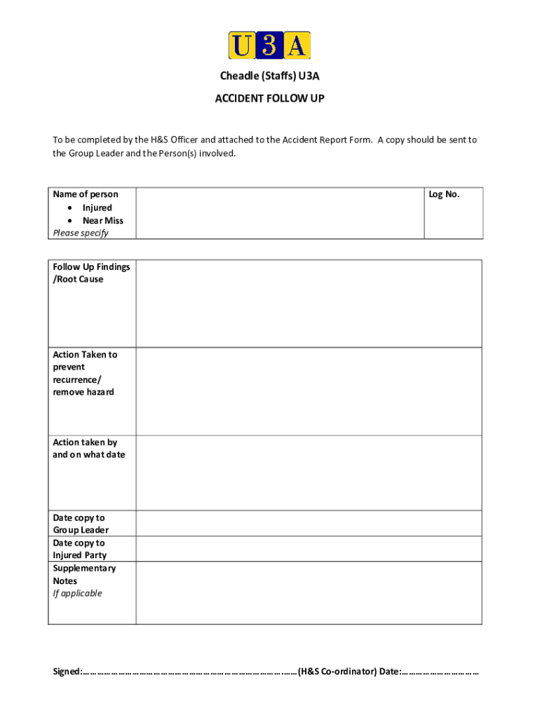 Cheaply (Staffs) U3A ACCIDENT FOLLOW UP To be completed by the H&S Officer and attached to the Accident Report Form. A copy should be sent to the Group Leader and the Person(s) involved. Name of person