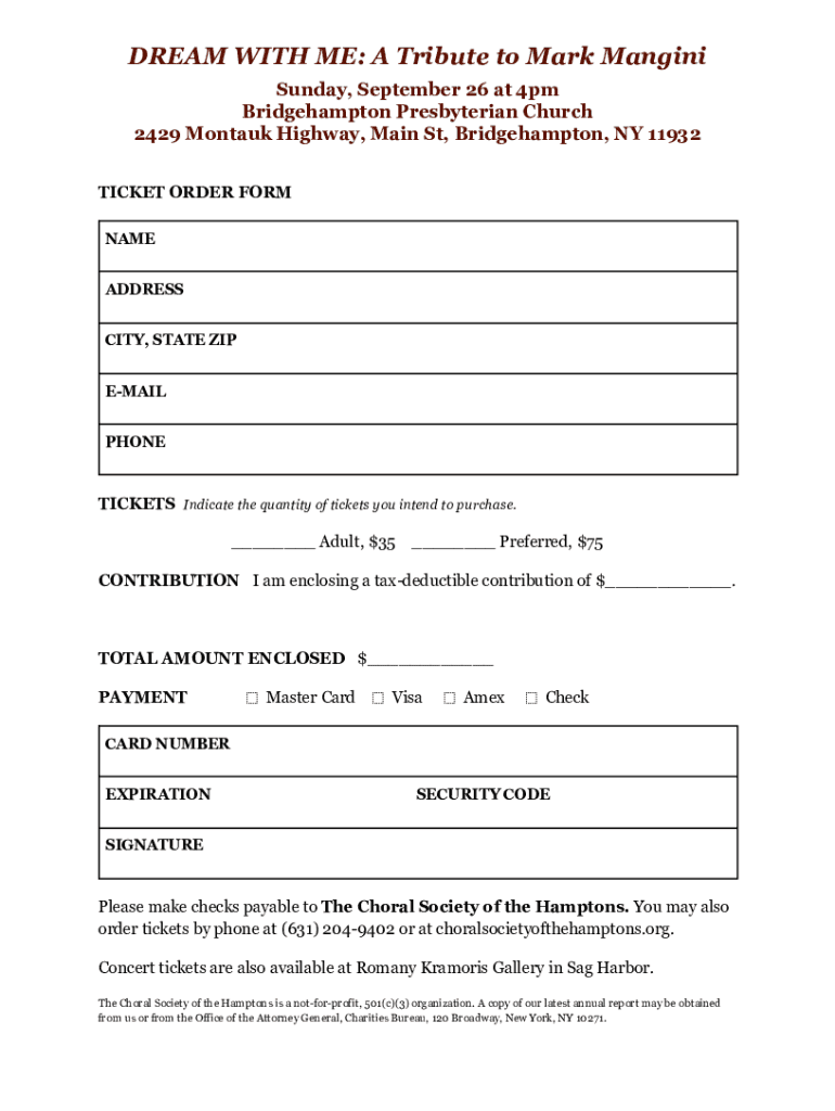 DREAM WITH ME: A Tribute to Mark Mancini Sunday, September 26 at 4pm Bridgehampton Presbyterian Church 2429 Montauk Highway, Main St, Bridgehampton, NY 11932 TICKET ORDER FORM NAME ADDRESS CITY, STATE