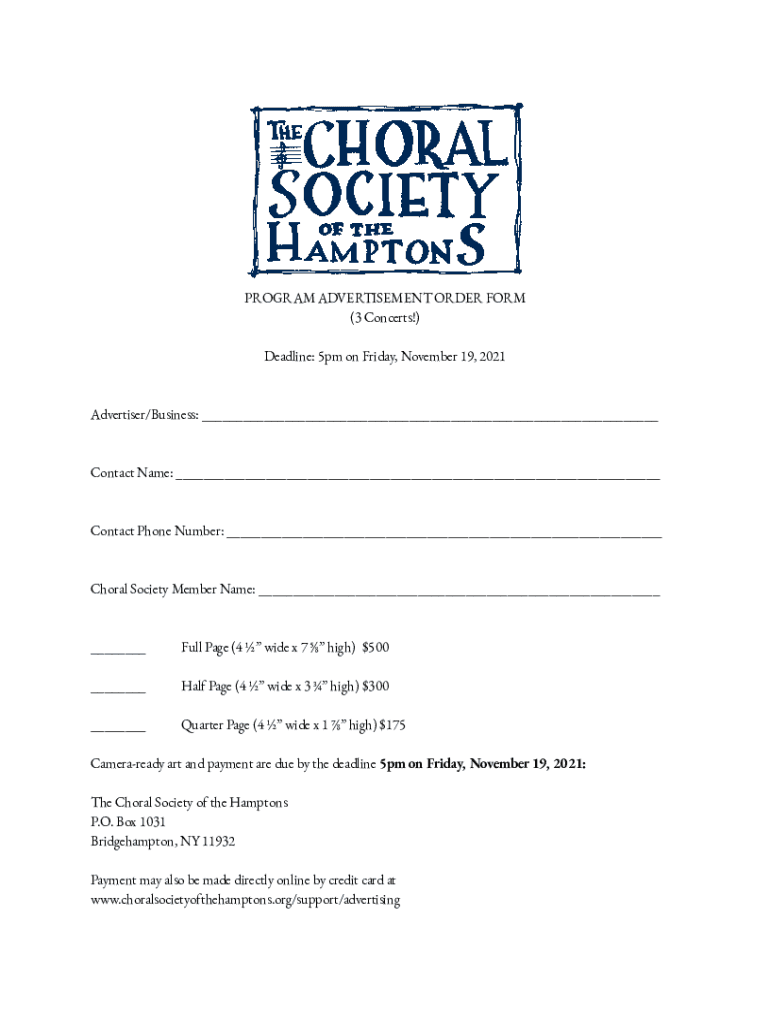 PROGRAM ADVERTISEMENT ORDER FORM (3 Concerts!) Deadline: 5pm on Friday, November 19, 2021Advertiser/Business: Contact Name: Contact Phone Number: Choral Society Member Name: Full Page (4 wide x 7