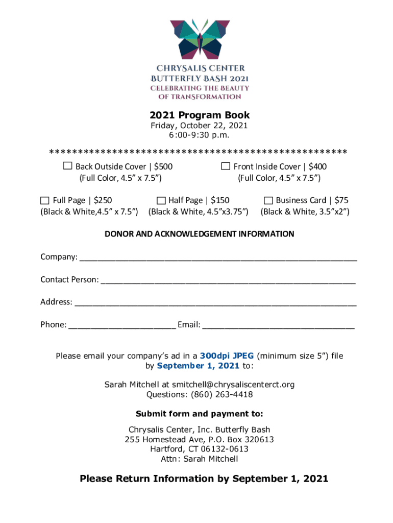 2021 Program Book Friday, October 22, 2021 6:009:30 p.m.**************************************************** Back Outside Cover $500 (Full Color, 4.5 7.5) Full Page $250 (Black & White,4.5 7.5)Front