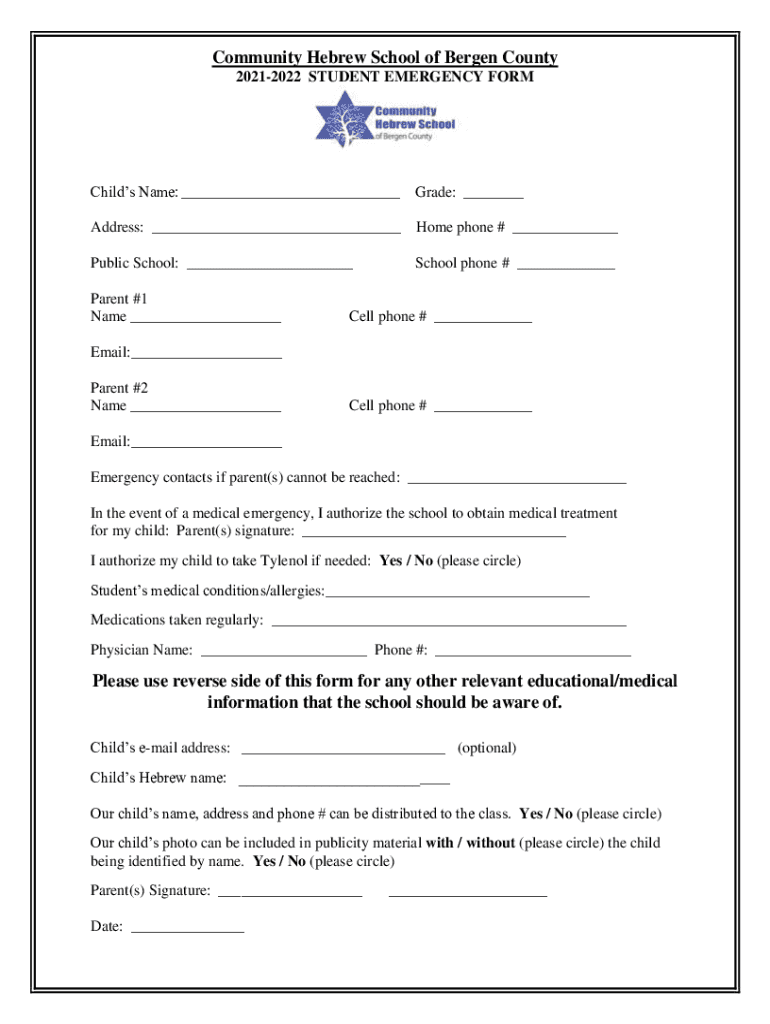 Community Hebrew School of Bergen County 20212022 STUDENT EMERGENCY Orchids Name: Grade: Address: Home phone # Public School: School phone # Parent #1 Name Cell phone # Email: Parent #2 Name Cell