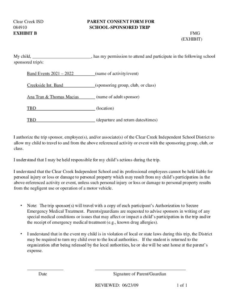 Clear Creek ISD 084910 EXHIBIT PARENT CONSENT FORM FOR SCHOOLSPONSORED TRIP FMG (EXHIBIT)My child, has my permission to attend and participate in the following school sponsored trip/s: Band Events