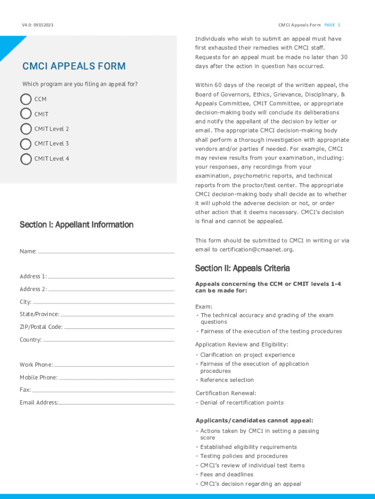 V4.0: 09152021CMCI Appeals Form PAGE 1Individuals who wish to submit an appeal must have first exhausted their remedies with CCI staff.CCI APPEALS FORM Which program are you filing an appeal for?