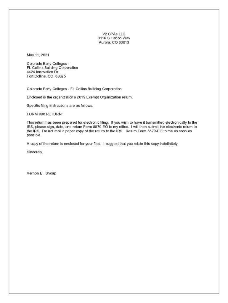 V2 CPA's LLC 3116 S Lisbon Way Aurora, CO 80013 May 11, 2021, Colorado Early Colleges Ft. Collins Building Corporation 4424 Innovation Dr Fort Collins, CO 80525 Colorado Early Colleges Ft. Collins