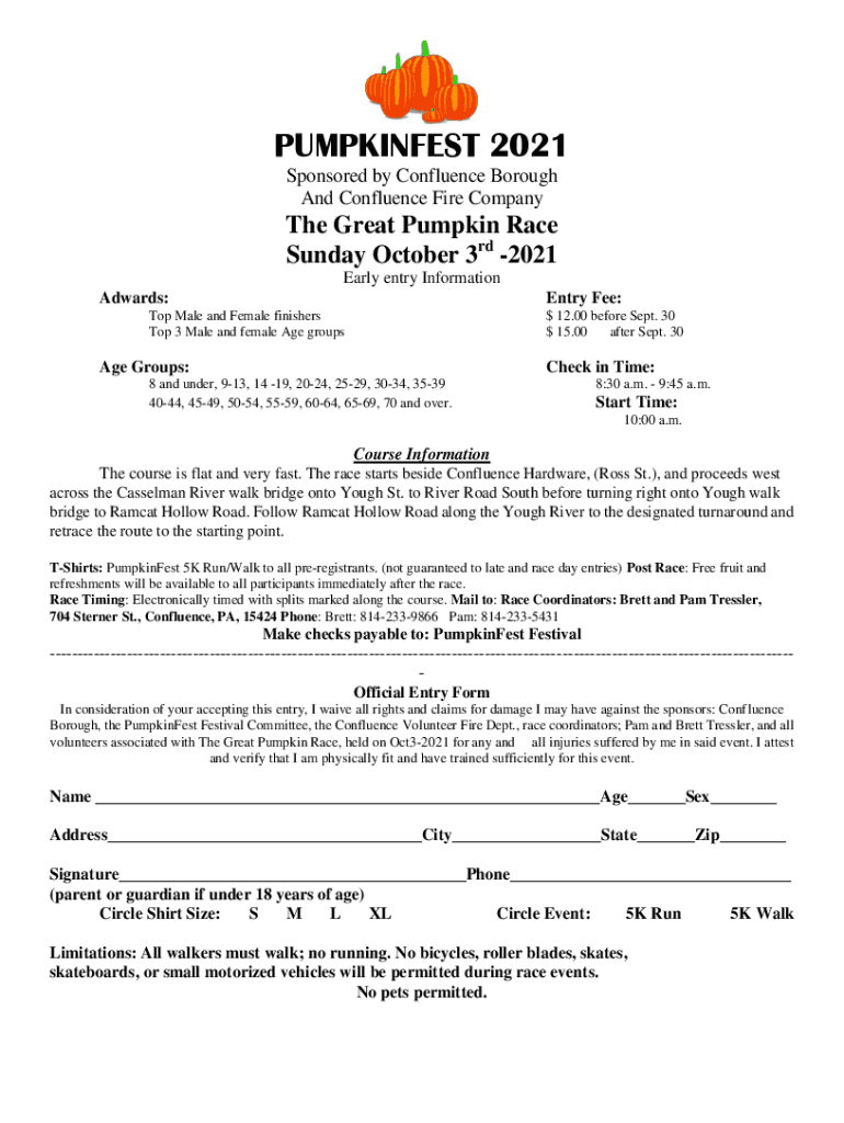 PUMPKINS 2021 Sponsored by Confluence Borough And Confluence Fire Company Great Pumpkin Race Sunday, October 3rd 2021 Early entry Information Awards: Top Male and Female finishers Top 3 Male and female