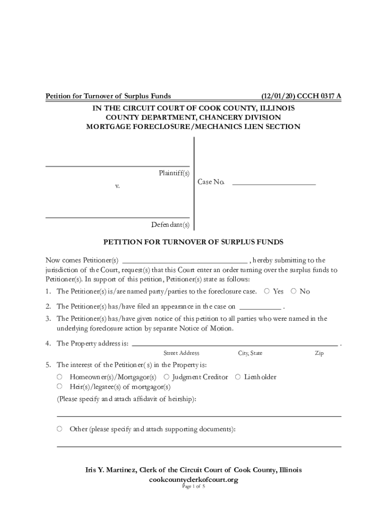 Petition for Turnover of Surplus Funds(12/01/20) CCC 0317 AIN THE CIRCUIT COURT OF COOK COUNTY, ILLINOIS COUNTY DEPARTMENT, CHANCERY DIVISION MORTGAGE FORECLOSURE/MECHANICS LIEN SECTIONPlaintiff(s)
