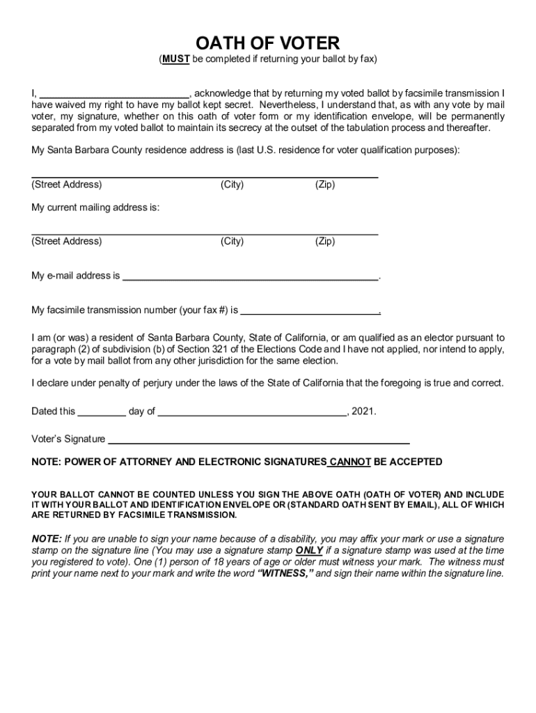 OATH OF VOTER(MUST be completed if returning your ballot by fax) I, acknowledge that by returning my voted ballot by facsimile transmission I have waived my right to have my ballot kept secret. Nevertheless,