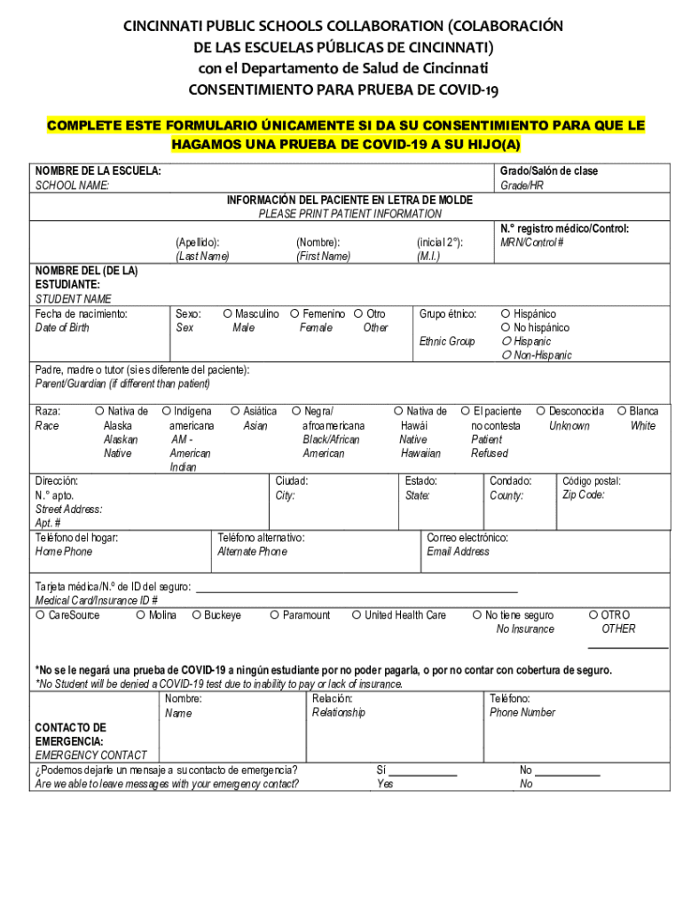 CINCINNATI PUBLIC SCHOOLS COLLABORATION (COLLABORATION DE LAS RESCUES PELICAN DE CINCINNATI) con El Department de Salud de Cincinnati CONSENTIMIENTO PARA PRU EBA DE COVID-19 COMPLETE ESTER FORMULA