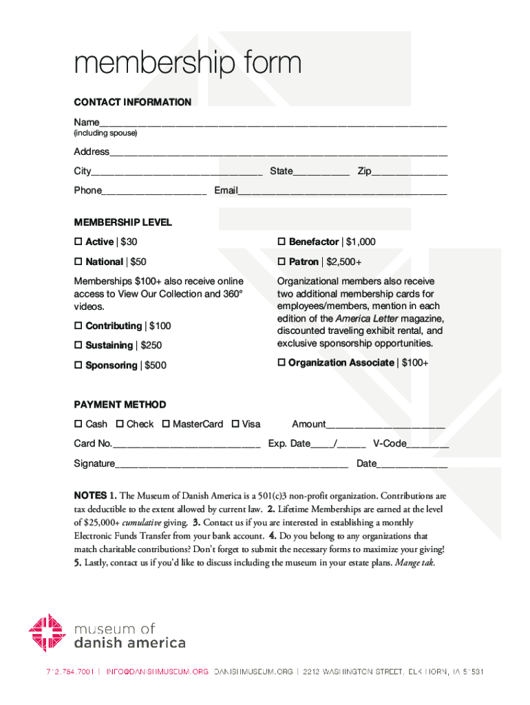 Membership form CONTACT INFORMATION Name (including spouse)Address City State Zip Phone Email MEMBERSHIP LEVEL Active $30 Benefactor $1,000 National $50 Patron $2,500+Memberships $100+ also receive