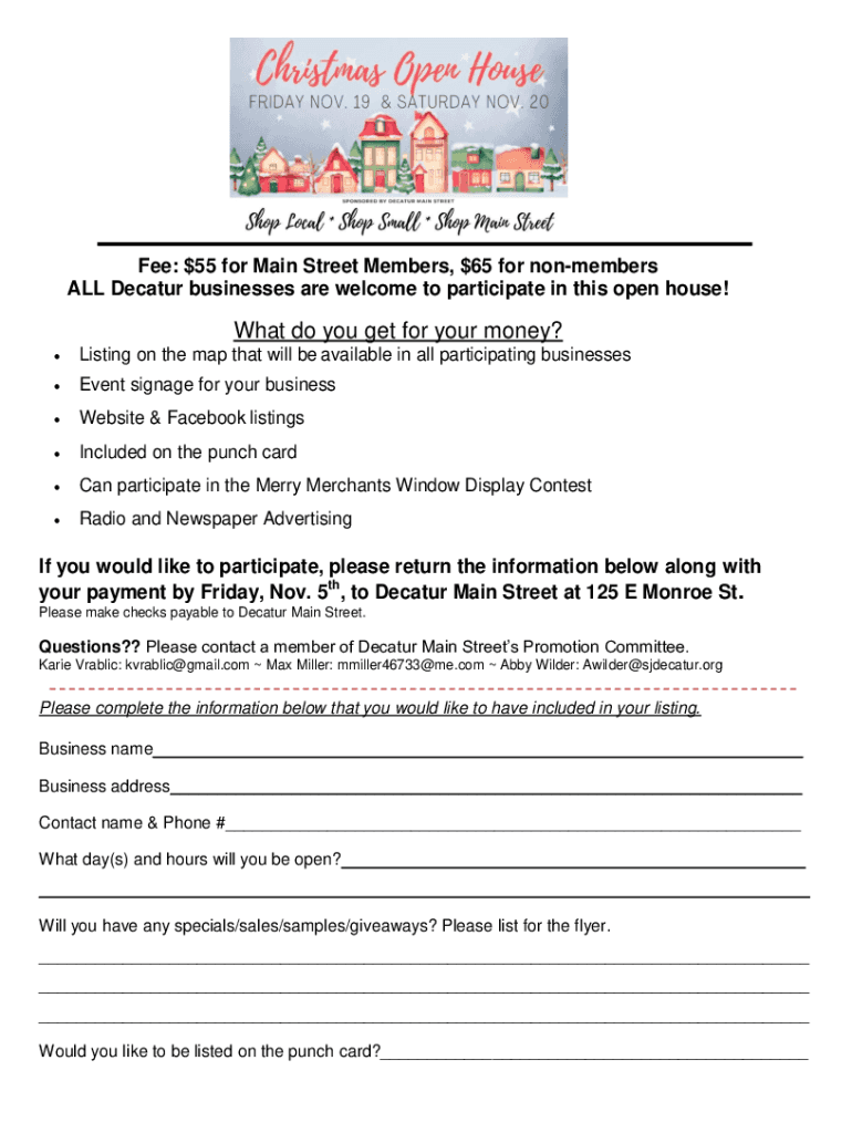 Fee: $55 for Main Street Members, $65 for nonmembers ALL Decatur businesses are welcome to participate in this open house! What do you get for your money? Listing on the map that will be available