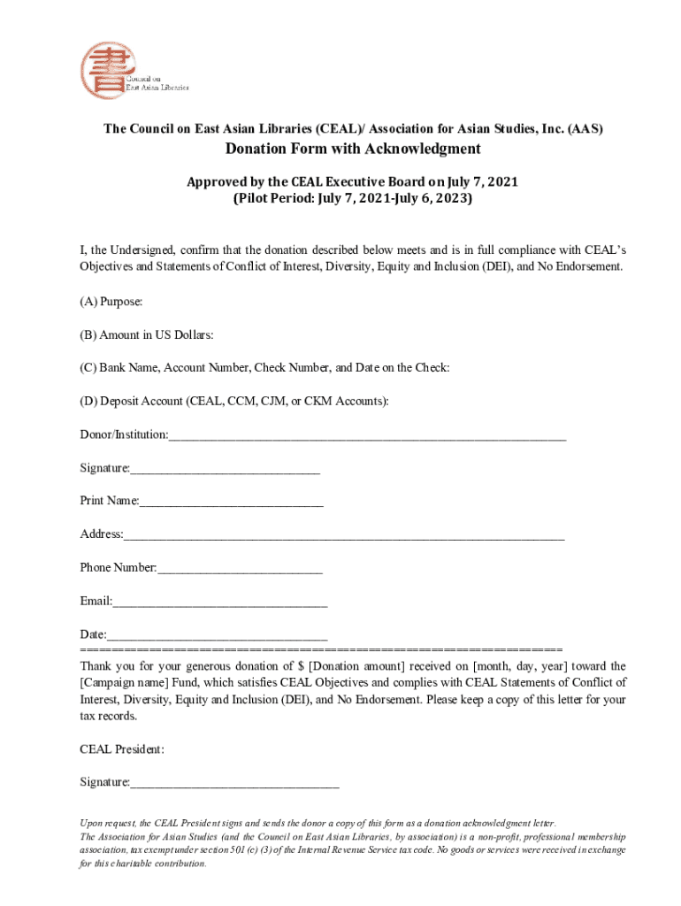 The Council on East Asian Libraries (DEAL)/ Association for Asian Studies, Inc. (AAS)Donation Form with AcknowledgmentApproved by the DEAL Executive Board on July 7, 2021 (Pilot Period: July 7, 2021July