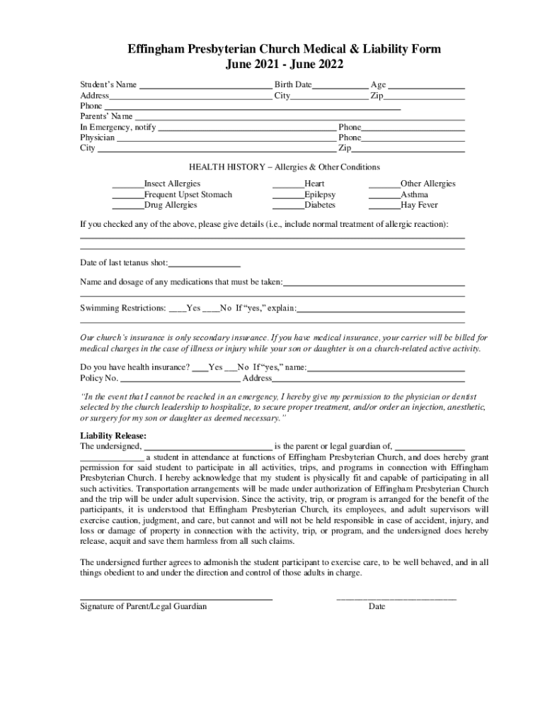 Effing ham Presbyterian Church Medical & Liability Form June 2021 June 2022 Students Name Address Phone Parents Name In Emergency, notify Physician Childbirth Date Cottage iPhone Phone Zip HEALTH