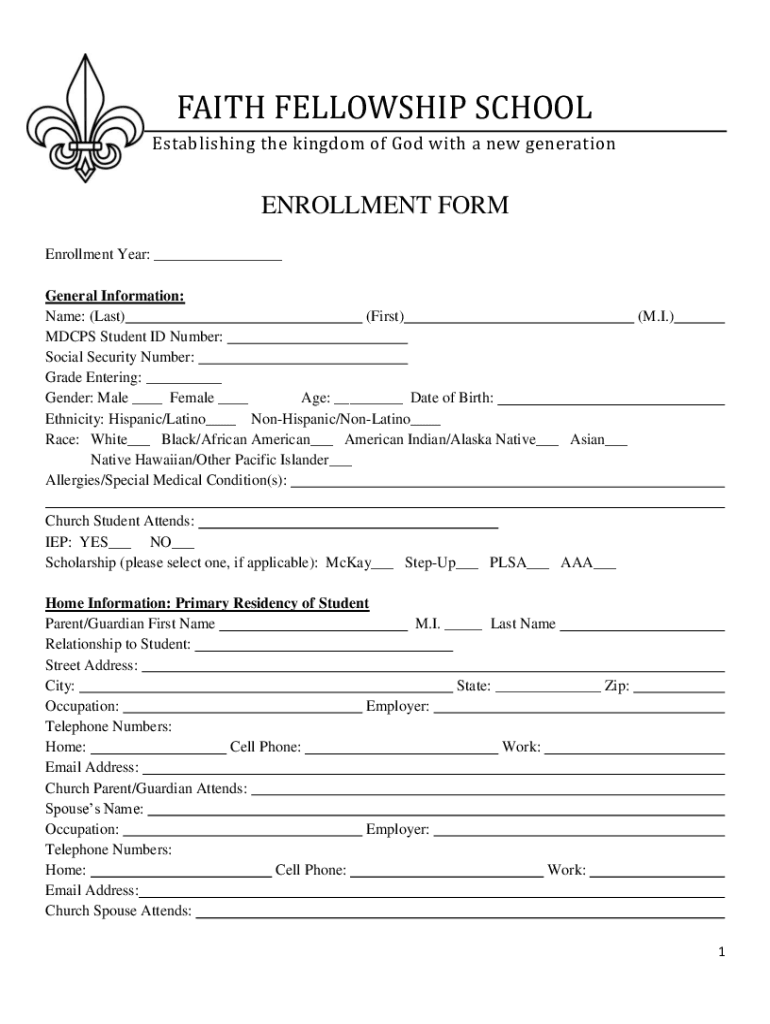 FAITH FELLOWSHIP SCHOOL Establishing the kingdom of God with a new generationENROLLMENT FORM Enrollment Year: General Information: Name: (Last) (First) (M.I.) MD CPS Student ID Number: Social Security