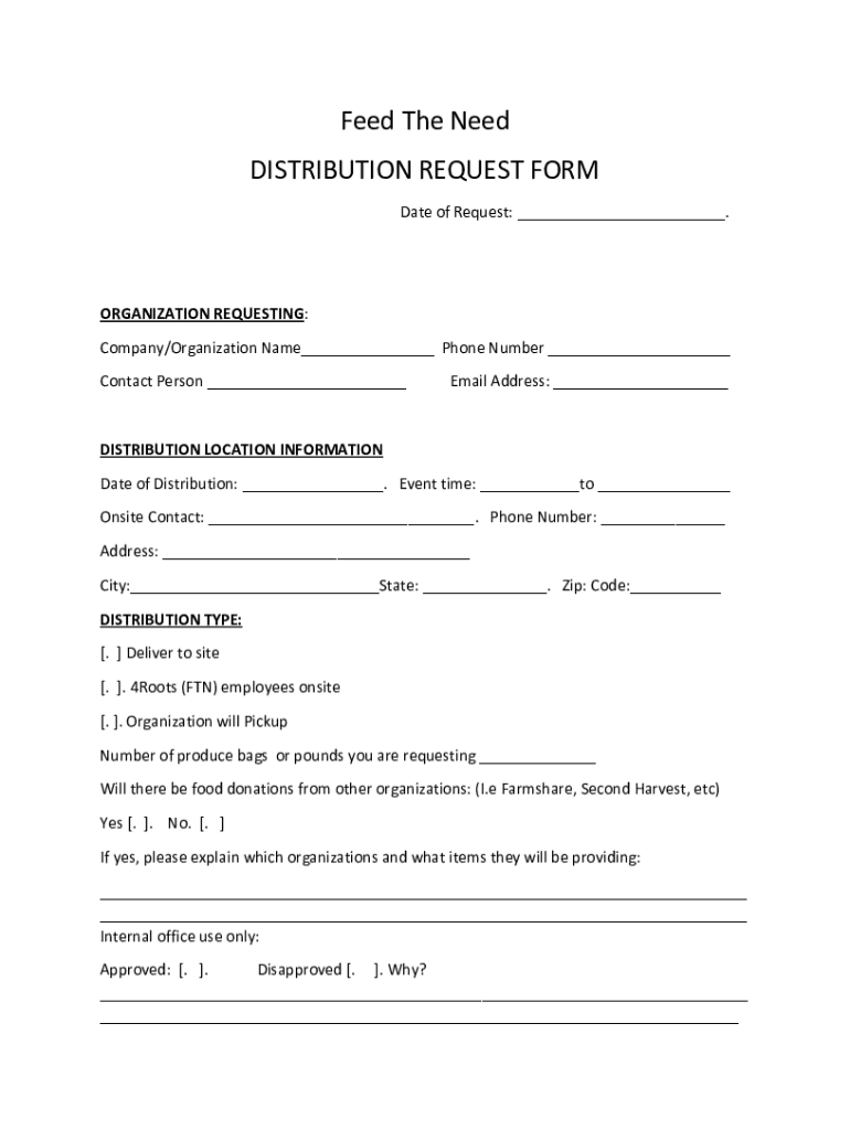 Feed The Need DISTRIBUTION REQUEST FORM Date of Request:.ORGANIZATION REQUESTING: Company/Organization Name Phone Number Contact Person Email Address: DISTRIBUTION LOCATION INFORMATION Date of Distribution:.