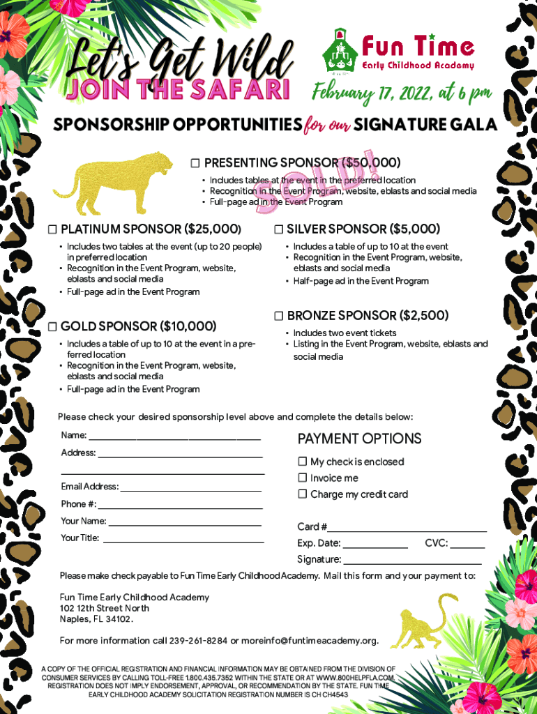 Let\'s Get Wild JOIN THE SAFARI February 17, 2022, at 6 sponsorship OPPORTUNITIES forourSIGNATURE GALA PRESENTING SPONSOR ($50,000) Includes tables at the event in the preferred location Recognition