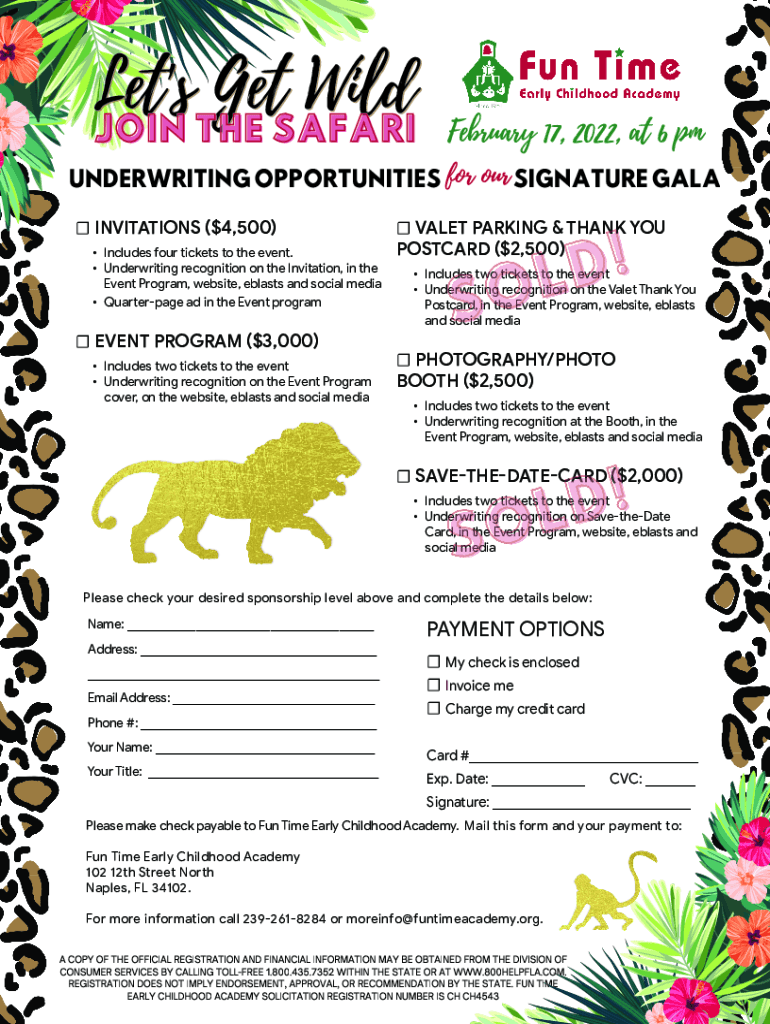 Let\'s Get Wild JOIN THE SAFARI February 17, 2022, at 6 underwriting OPPORTUNITIES for INVITATIONS ($4,500) Includes four tickets to the event. Underwriting recognition on the Invitation, in the Event