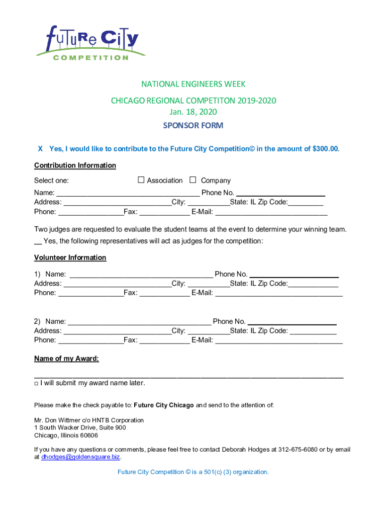 NATIONALENGINEERSWEEK CHICAGOREGIONALCOMPETITON20192020 Jan.18, 2020 SPONGIFORM Yes, I would like to contribute to the Future City Competition in the amount of $300.00. Contribution Information Select