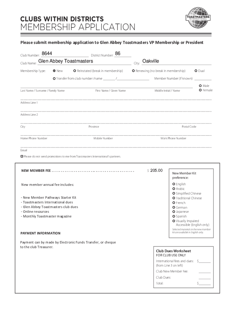 CLUBS WITHIN DISTRICTSMEMBERSHIP APPLICATION Please submit membership application to Glen Abbey Toastmasters VP Membership or President8644 86 Club Number: District Number: Glen Abbey Toastmasters