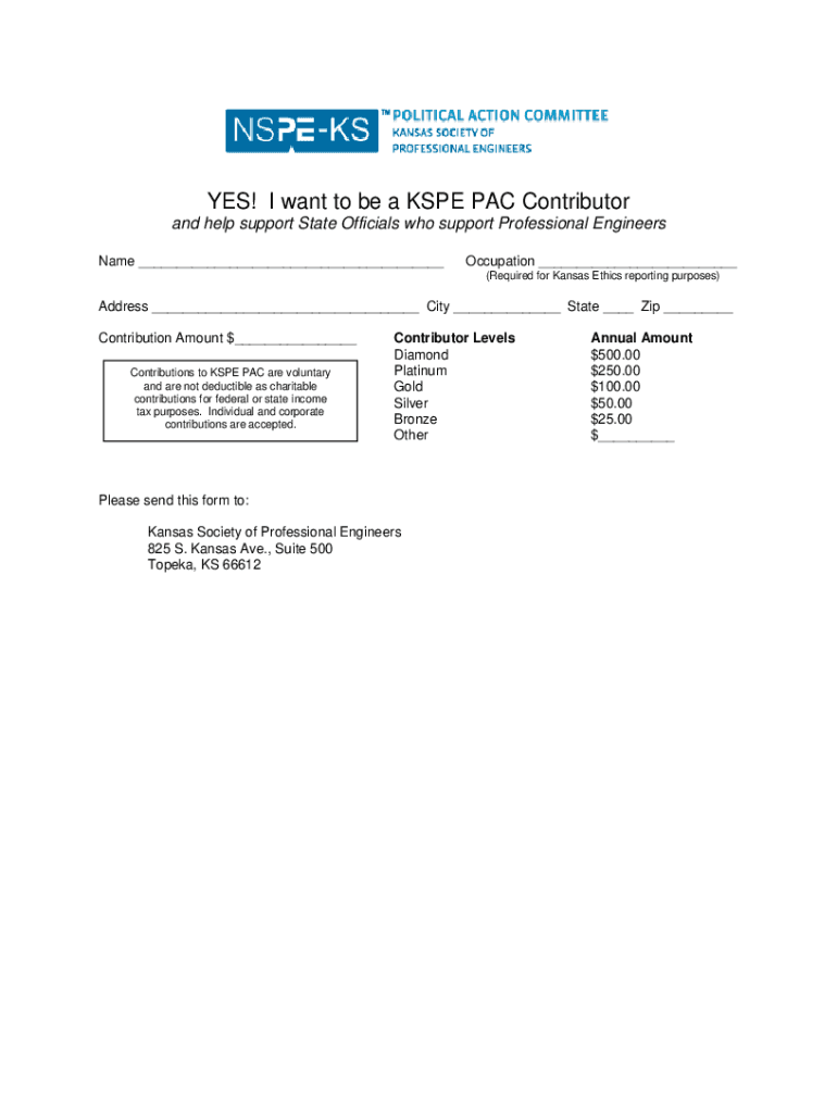 YES! I want to be an ESPE PAC Contributor and help support State Officials who support Professional Engineers Name Occupation (Required for Kansas Ethics reporting purposes)Address City State Zip