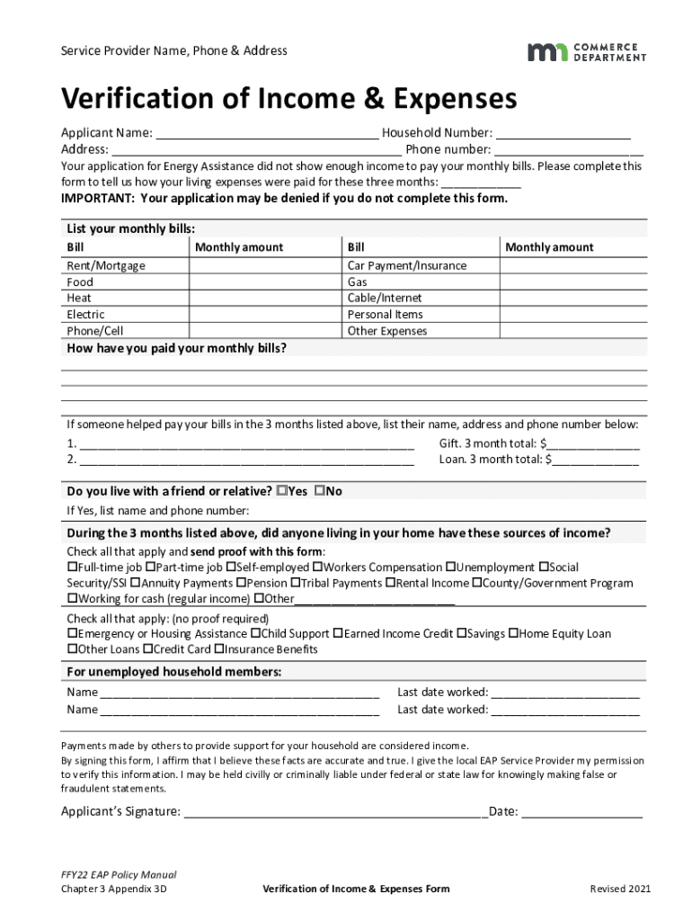 Service Provider Name, Phone & AddressVerification of Income & Expenses Applicant Name: Household Number: Address: Phone number: Your application for Energy Assistance did not show enough income to