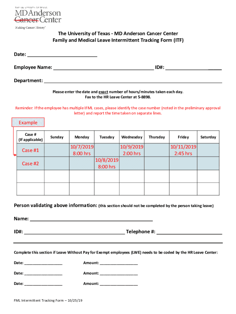 The University of Texas MD Anderson Cancer Center Family and Medical Leave Intermittent Tracking Form (ITF) Date: Employee Name:ID#: Department: Please enter the date and exact number of hours/minutes