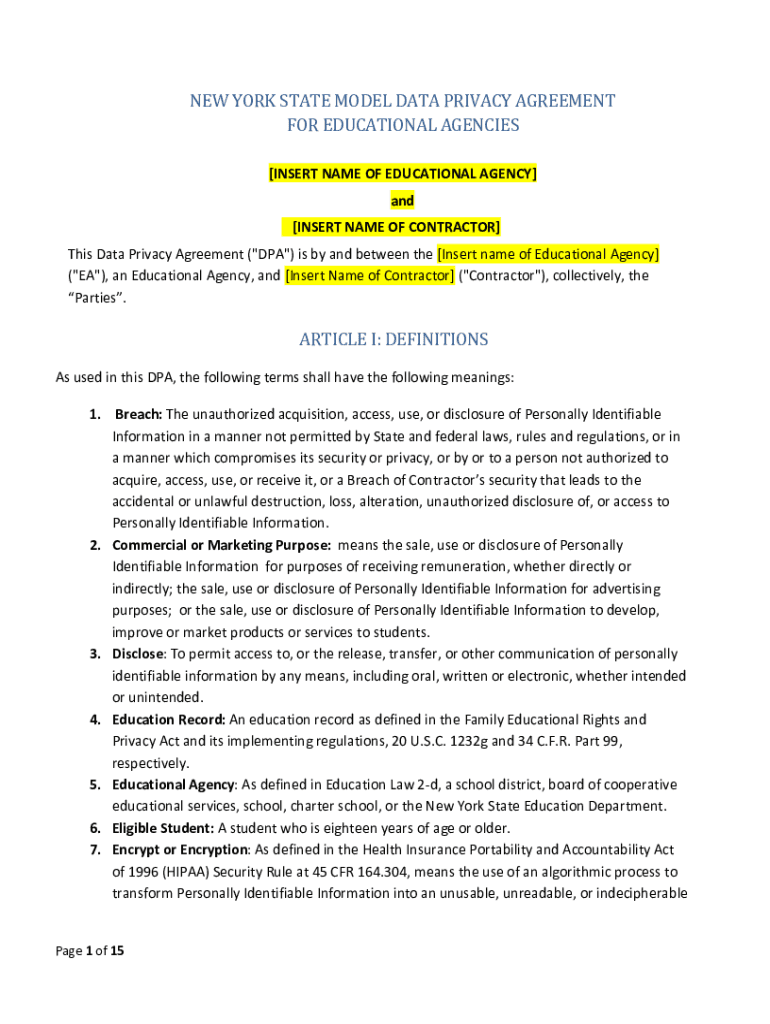 Get the free NEW YORK STATE MODEL DATA PRIVACY AGREEMENT FOR ...