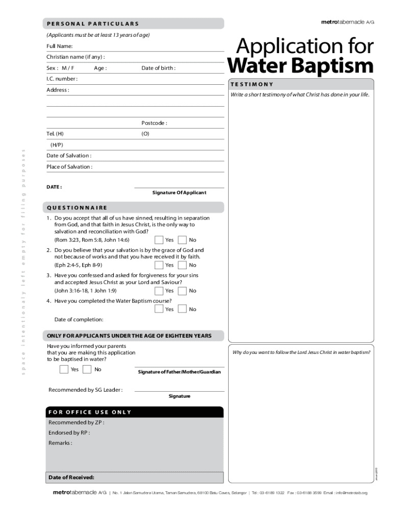 Metro tabernacle A/GP e r s o n an l Pa r t i c u l an r s (Applicants must be at least 13 years of age)Application for Water Baptismal Name: Christian name (if any) : Sex : M / FAGE :Date of birth