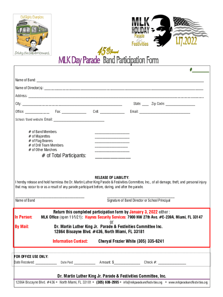 # Name of Band: Name of Director(s): Address: City: Office: Fax: Cell: State: Zip Code: Email: School / Band website: Email: # of Band Members # of Majorettes # of Flag Bearers # of Drill Team Members