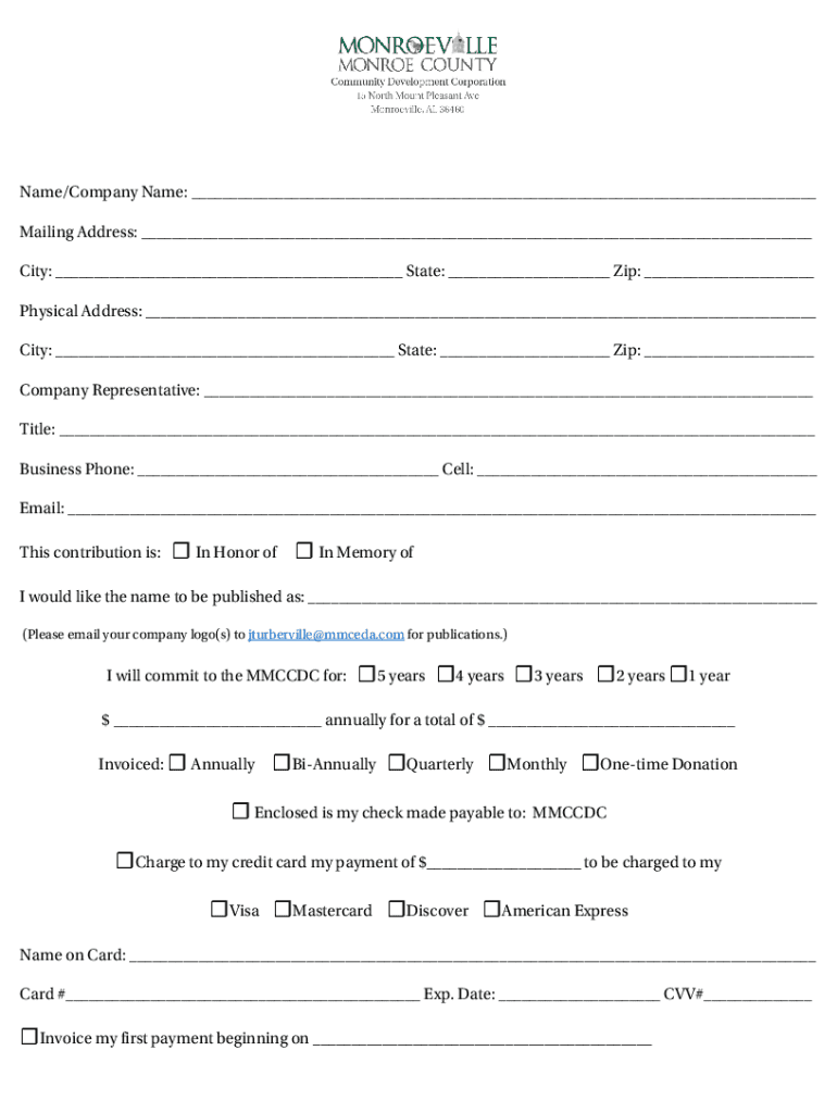 Name/Company Name: Mailing Address: City: State: Zip: Physical Address: City: State: Zip: Company Representative: Title: Business Phone: Cell: Email: This contribution is: In Honor of In Memory of