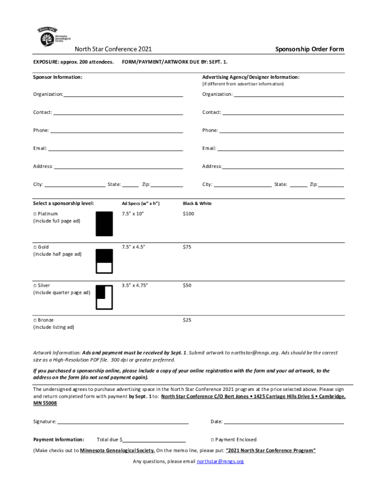 North Star Conference 2021 EXPOSURE: approx. 200 attendees. Sponsorship Order Former/PAYMENT/ARTWORK DUE BY: SEPT. 1. Sponsor Information:Advertising Agency/Designer Information: (if different from