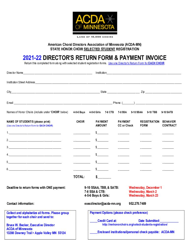 American Choral Directors Association of Minnesota (ACD AMN) STATE HONOR CHOIR SELECTED STUDENT REGISTRATION202122 DIRECTORS RETURN FORM & PAYMENT INVOICE Return this completed form along with selected