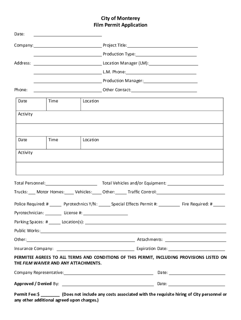 CityofMonterey FilmPermitApplication Date: Company: Projectile: ProductionType: Address: LocationManager(LM): L. M. Phone: ProductionManager: Phone: OtherContact: Date Activity TimeLocationTimeLocationTotalPersonnel: