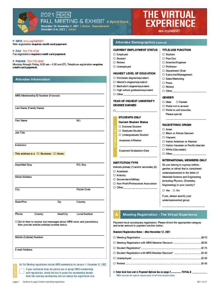 WEB mrs.org/fall2021 Web registration requires credit card payment. Attendee Demographics (optional) FAX 724.779.4732 Fax registration requires credit card payment. PHONE 724.779.3003 Monday through