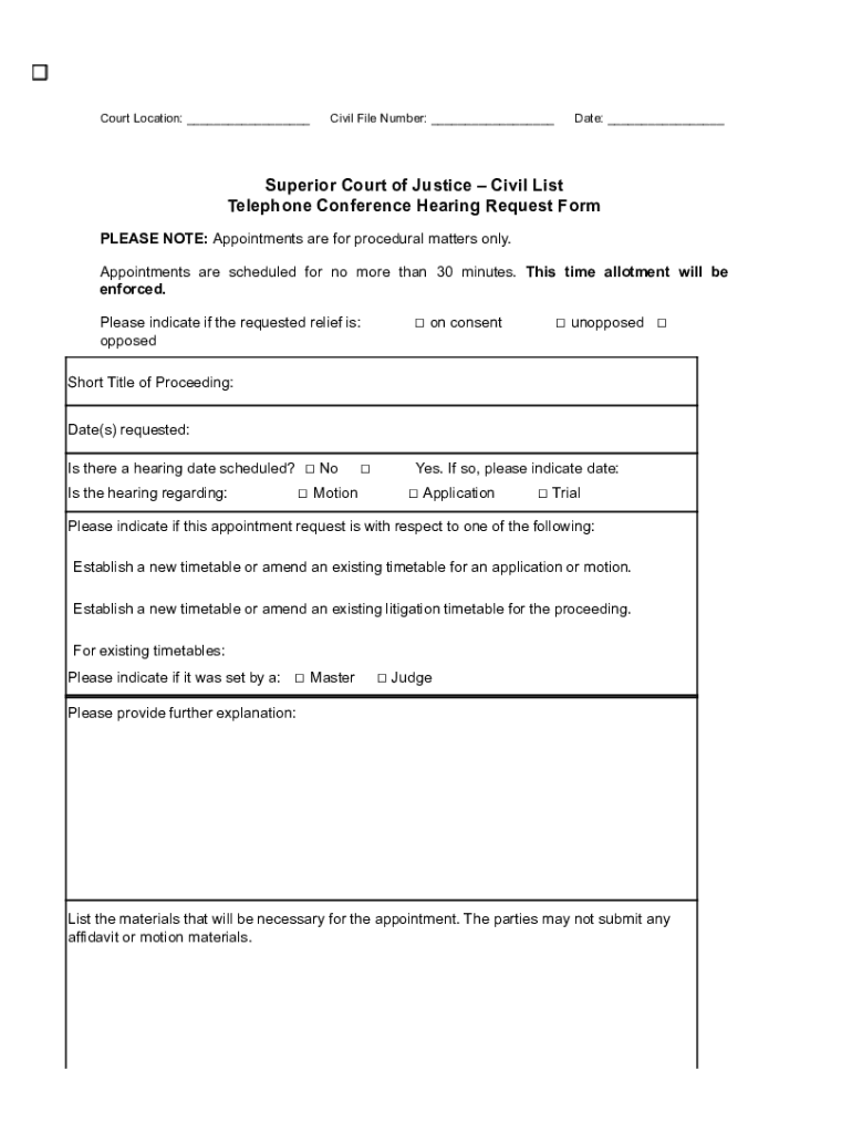 Court Location: Civil File Number: Date: Superior Court of Justice Civil List Telephone Conference Hearing Request Form PLEASE NOTE: Appointments are for procedural matters only. Appointments are