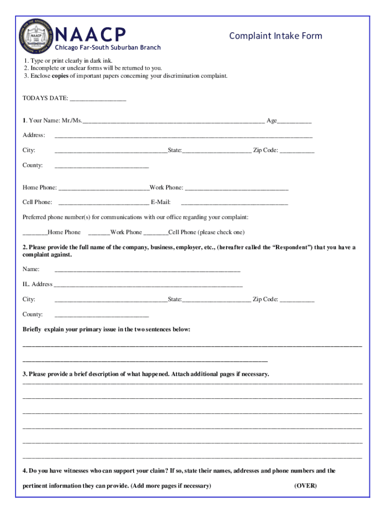 NA A CP Complaint Intake Form Chicago Far South Suburban Branch1. Type or print clearly in dark ink. 2. Incomplete or unclear forms will be returned to you. 3. Enclose copies of important papers concerning