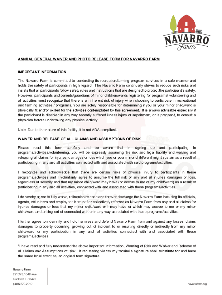 The Navarro farm waiver form may require individuals to report their name, contact information, emergency contact, and signature acknowledging the risks.