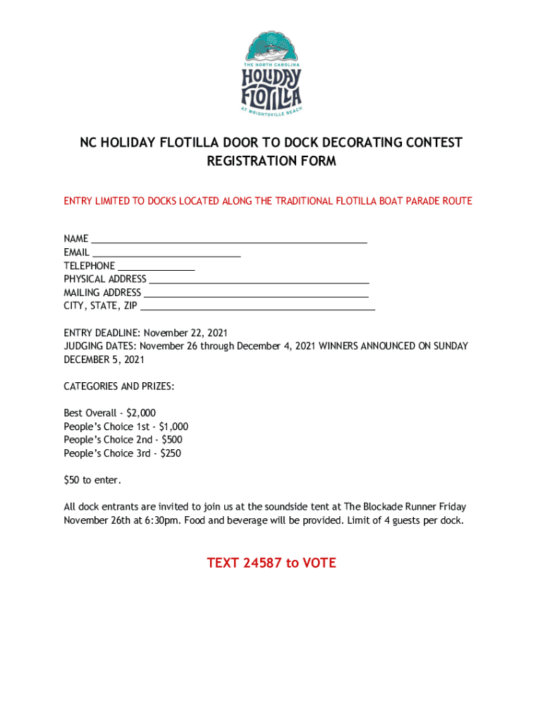 NC HOLIDAY FLOTILLA DOOR TO DOCK DECORATING CONTEST REGISTRATION FORM ENTRY LIMITED TO Dock LOCATED ALONG THE TRADITIONAL FLOTILLA BOAT PARADE ROUTINE EMAIL TELEPHONE PHYSICAL ADDRESS MAILING ADDRESS