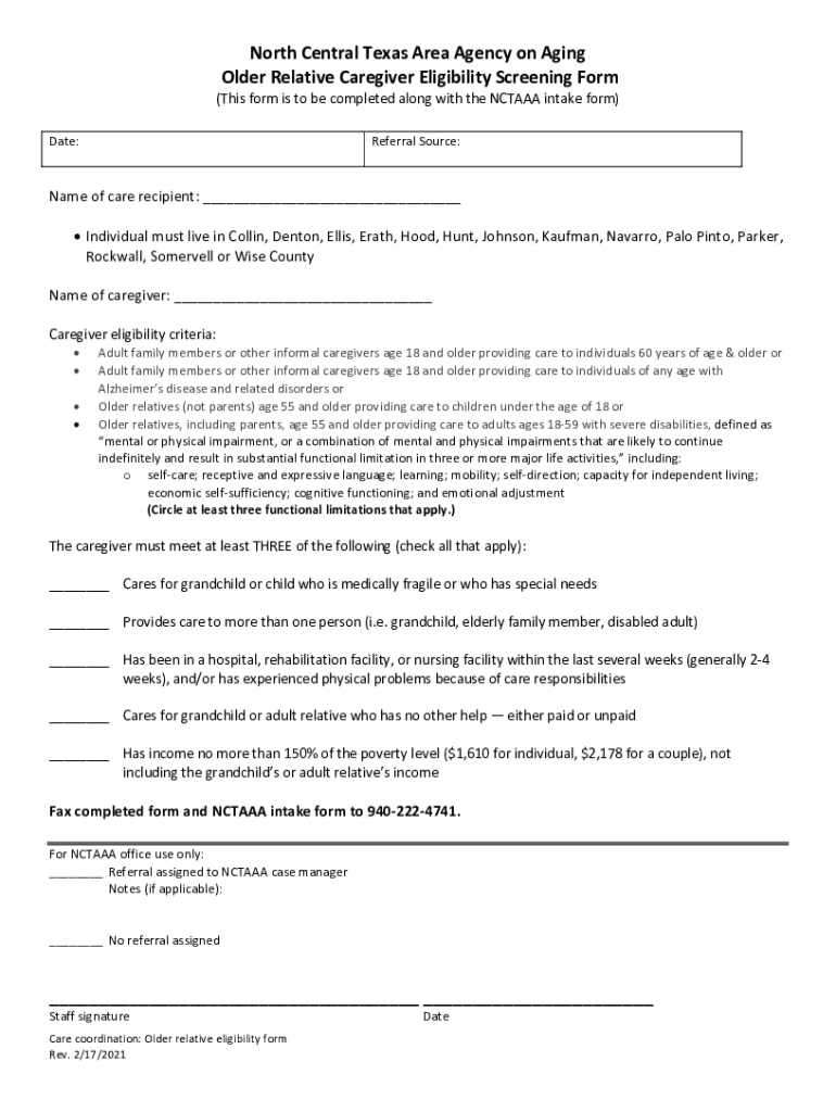 North Central Texas Area Agency on Aging Older Relative Caregiver Eligibility Screening Form(This form is to be completed along with the NCAA intake form) Date:Referral Source:Name of care recipient: