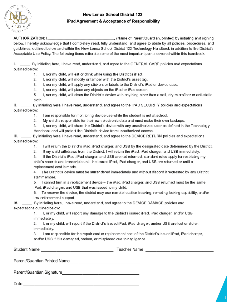 Get the free New Lenox School District 122 iPad Agreement & Acceptance ...