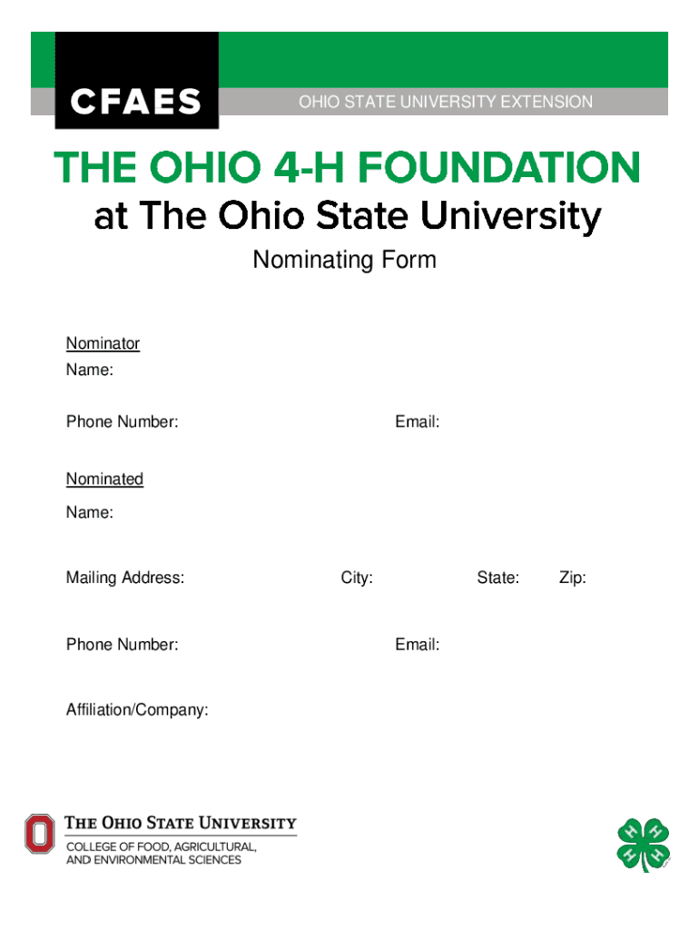 OHIO STATE UNIVERSITY EXTENSIONNominating FormNominator Name: Phone Number:Email:Nominated Name:Mailing Address:Phone Number:Affiliation/Company:City:State:Email:Zip:4H Connection/ Experiences:Why