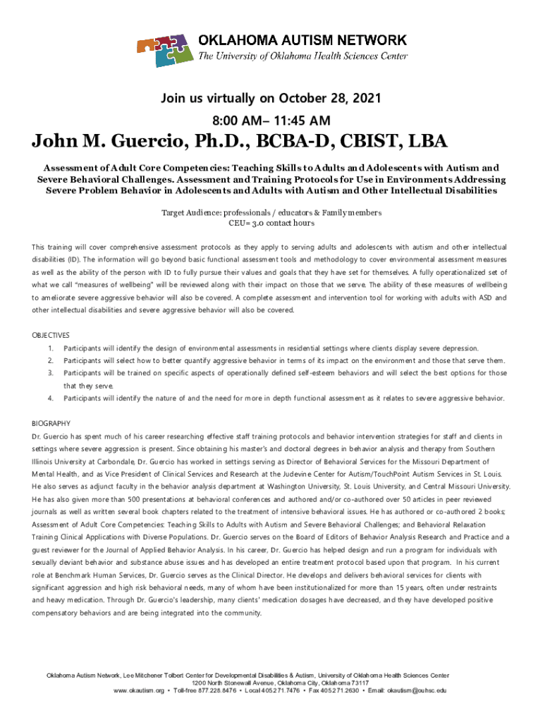 Join us virtually on October 28, 2021 8:00 AM 11:45 AM John M. Puerto, Ph.D., BCB AD, CUBIST, LBA Assessment of Adult Core Competencies: Teaching Skills to Adults and Adolescents with Autism and Severe
